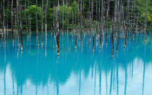 Голубой пруд в Хоккайдо, из-за содержания в воде гидроксида алюминия имеет красивый голубой цвет. Вода в нем постоянно меняет цвет в зависимости от времени суток.