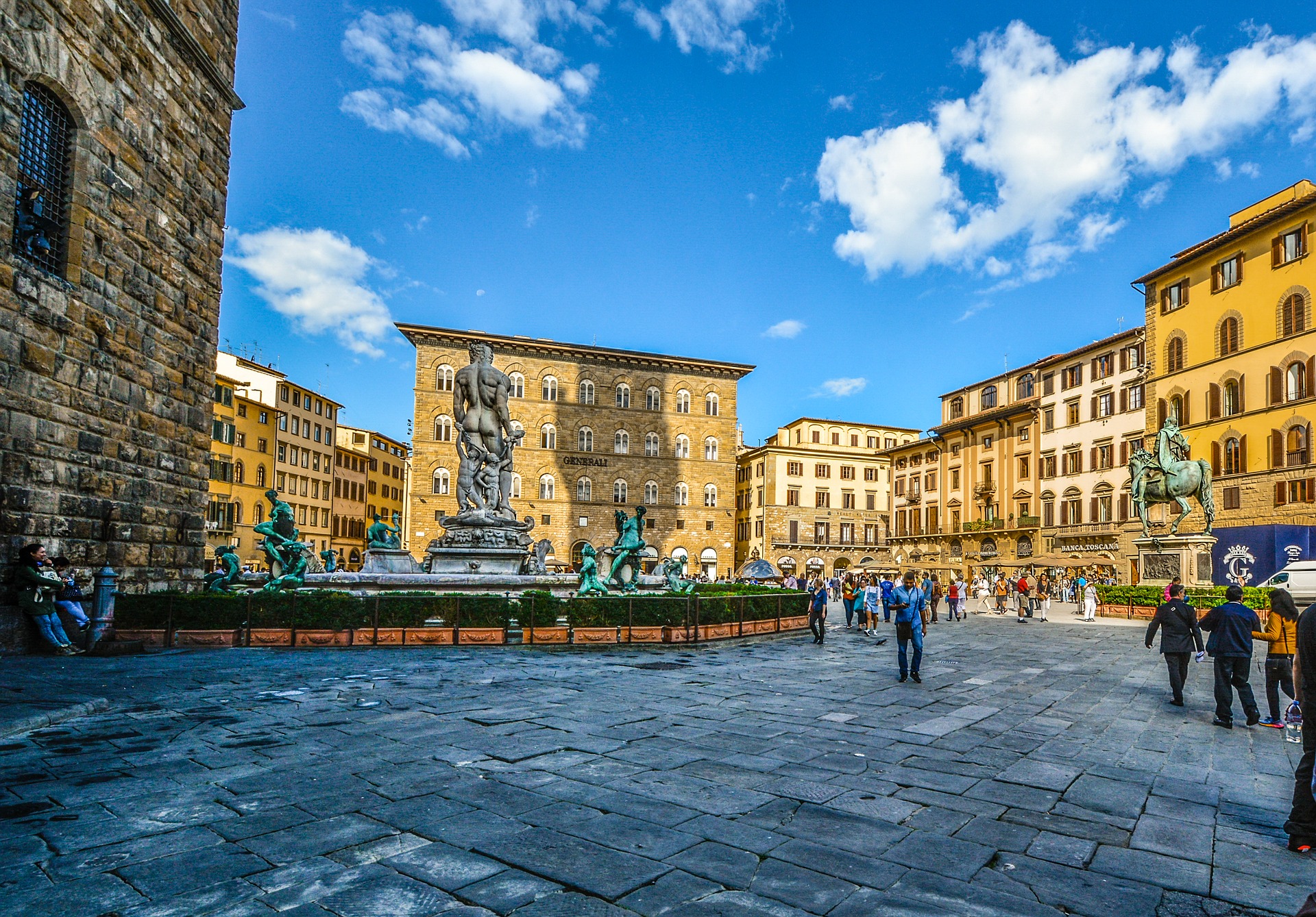 Площа Синьйорії, закладену в XІІІ ст., прикрашають прекрасні скульптури: «Юдіф» (копія) і «Мардзоккі» Донателло, «Давид» (копія) Мікеланджело, «Геркулес» Бандінеллі, пам'ятник Козімо Медічі роботи Джамболонії, фонтан Нептуна, створений Б. Амманаті і ін. Поруч з площею знаходиться Палаццо Веккьо (XІІІ ст.) - романський палац-фортеця, велика частина якого є музеєм. Його вежа, побудована Арнольфо ді Камбіо, має висоту 94 м. Крім того, на площу Синьйорії виходять Торгівельний суд (XІV ст.), Палац Угуччоні (XVІ ст.) І Лоджіі деї Ланці (XІV ст.) - музей під відкритим небом.