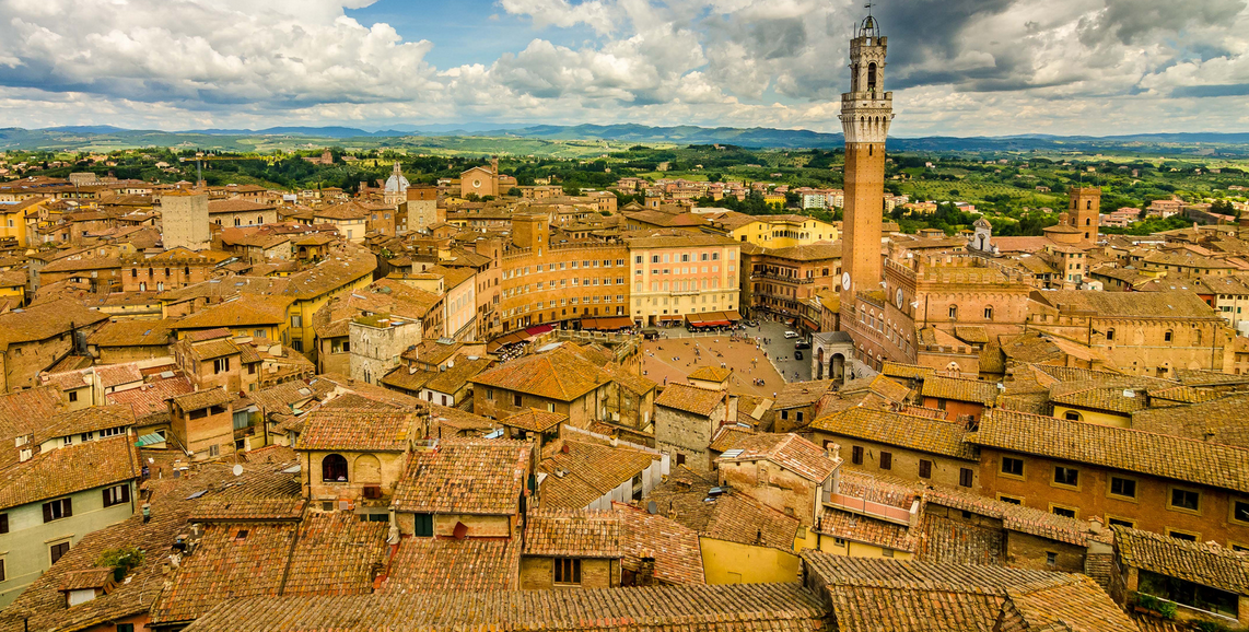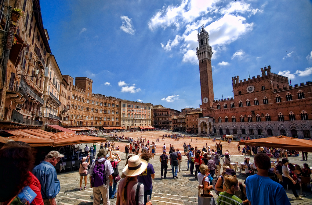 Як правило, туристичні маршрути починаються з Пьяцца дель Кампо (La Piazza del Campo) - унікальної величної середньовічної площі, що має напівкруглу увігнуту форму, від чого її називають «черепашкою». Саме тут, на сходженні трьох пагорбів перетиналися основні дороги і розташовувався міський ринок, а пізніше, в XIII-XIV століттях, тут були побудовані адміністративні будівлі.